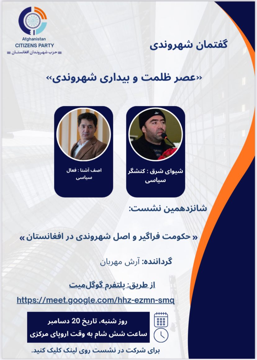 اطلاعیه! حزب شهروندان افغانستان در ادامه برنامه تخصصی‌ماهانه برگزار می‌کند: گفتمان شهروندی عنوان نشست: حکومت فراگیر و اصل شهروندی در افغانستان (بررسی انتقادی گفتمان «حکومت فراگیر» در پرتو حقوق شهروندی و تکثر اجتماعی افغانستان) این نشست روز شنبه، ۲۰ دسامبر، ساعت ۱۸:۰۰ به وقت اروپای مرکزی (CET)، به‌صورت آنلاین از طریق پلتفرم Google Meet برگزار …
